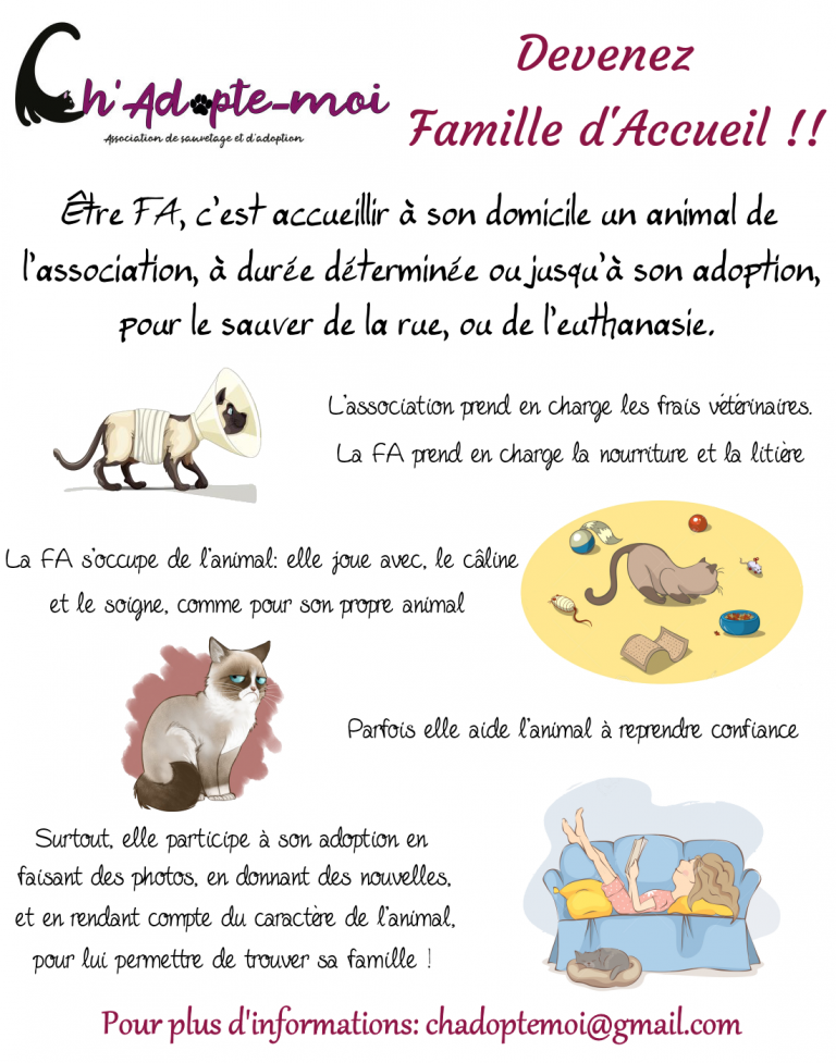 Être FA, c’est accueillir à son domicile un chat de l’association, à durée déterminée ou jusqu’à son adoption, pour le sauver de la rue ou de l’euthanasie. La FA s’occupe de l’animal en accueil comme de son propre chat. Elle le remet en confiance s’il y a besoin, rend compte de son caractère et fait des photos pour lui permettre l’adoption la plus réussie.