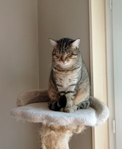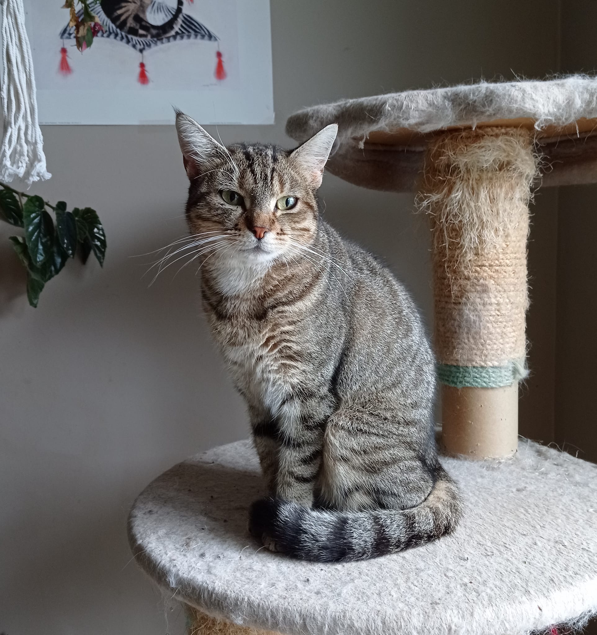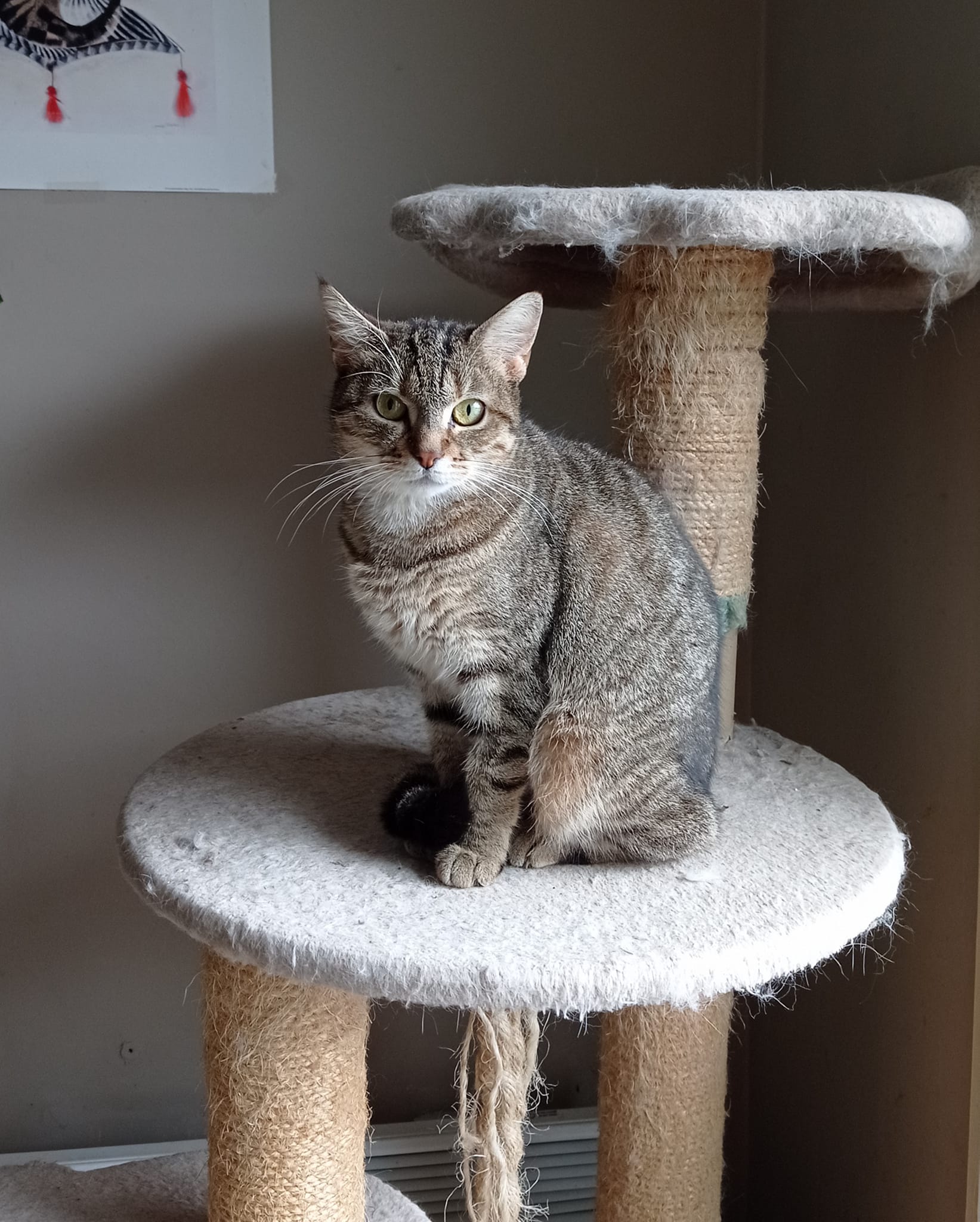 La Crêpe est une minette de compagnie pour les autres chats. Elle adore ses congénères et cherche leur contact. Ce qui n’est pas le cas pour les humains, elle cohabite avec nous mais cherche peu le contact. Après 8 mois de cohabitation, elle commence à se laisser caresser et à venir en chercher occasionnellement.